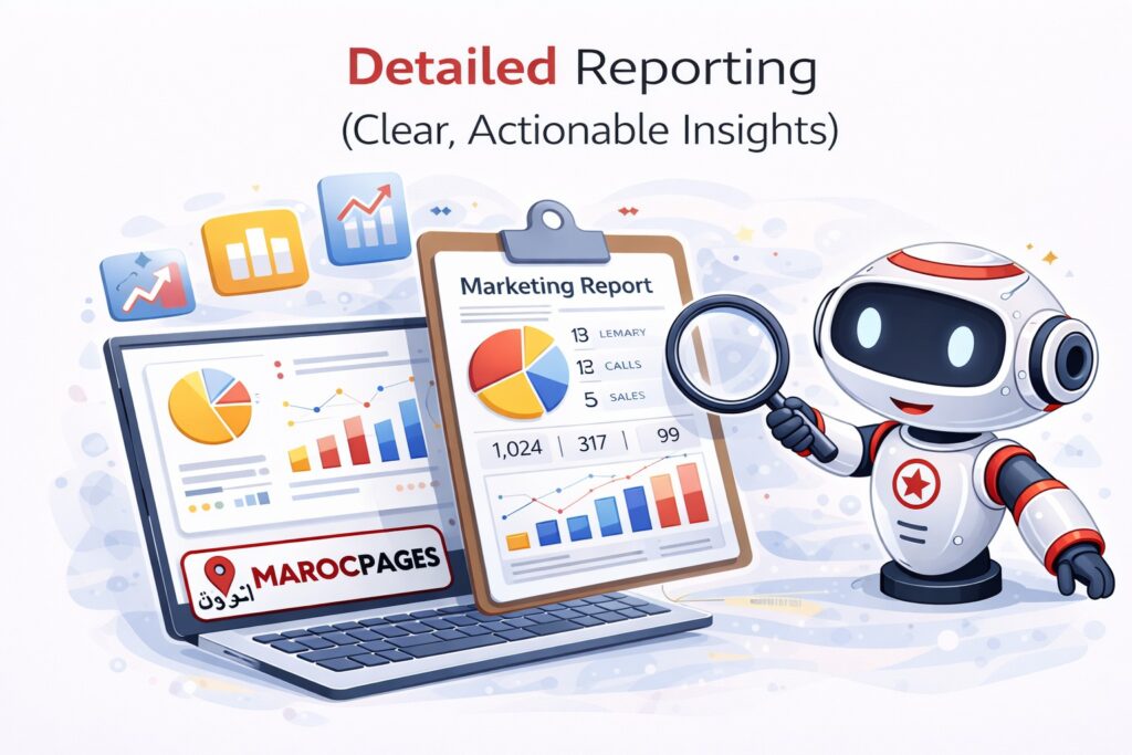 One of the biggest frustrations for businesses investing in marketing is not knowing what is actually working. Money is spent on advertising, social media, or SEO, but there is little clarity on how many customers are being generated, where they are coming from, and whether the investment is worthwhile. Maroc Pages’ Detailed Reporting service solves this problem by providing clear, transparent, and actionable insights into your marketing performance.